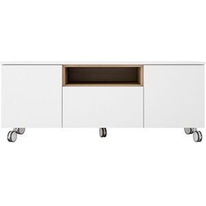 Mueble de TV fabricado en fibra de alta densidad lacada y chapa de roble natural laminado. Incorpora dos cajones y un hueco para aparatos multimedia. Un mueble de líneas actuales que proporciona diferentes espacios de ordenación con gran capacidad de almacenaje.